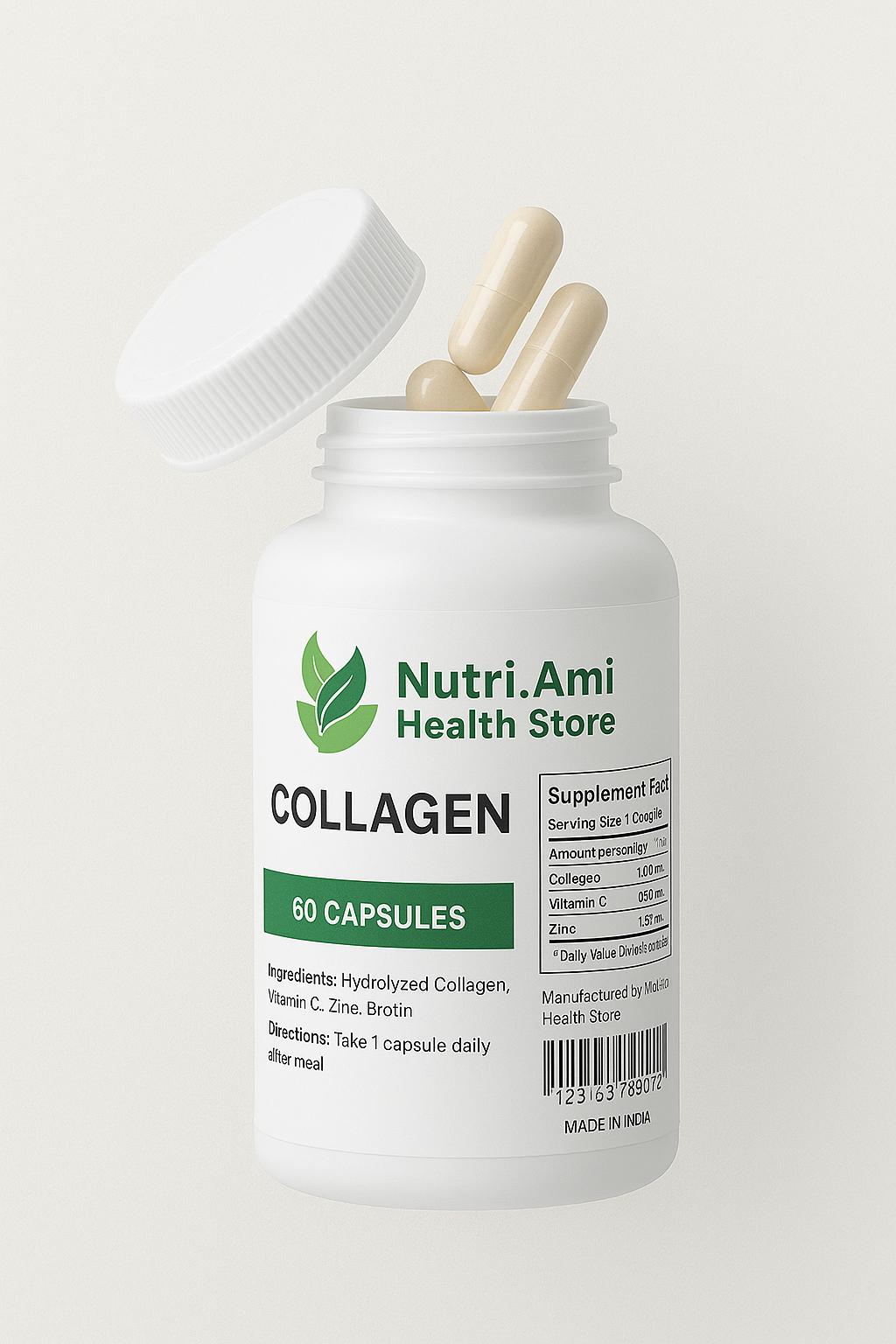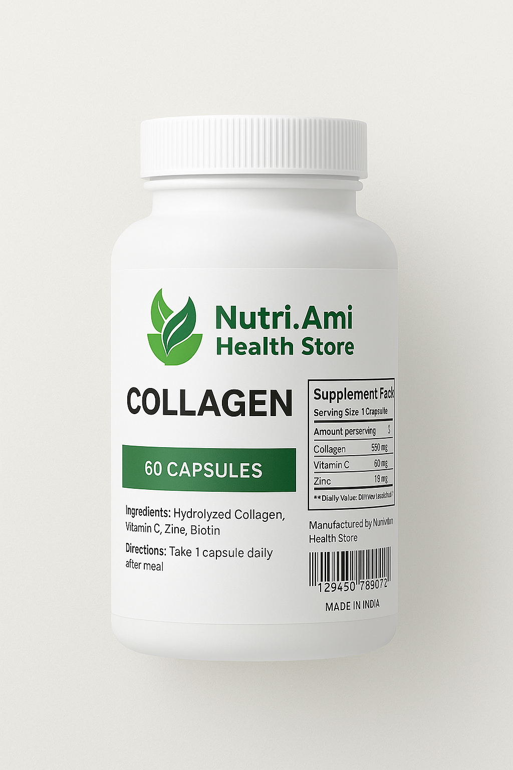 Nutri.Ami Collagen+ Capsules are specially formulated to nourish your skin, hair, and nails from within. Made with 99.7% pure collagen peptides, these capsules help boost natural collagen production, improve skin elasticity, and strengthen hair roots and nail texture.